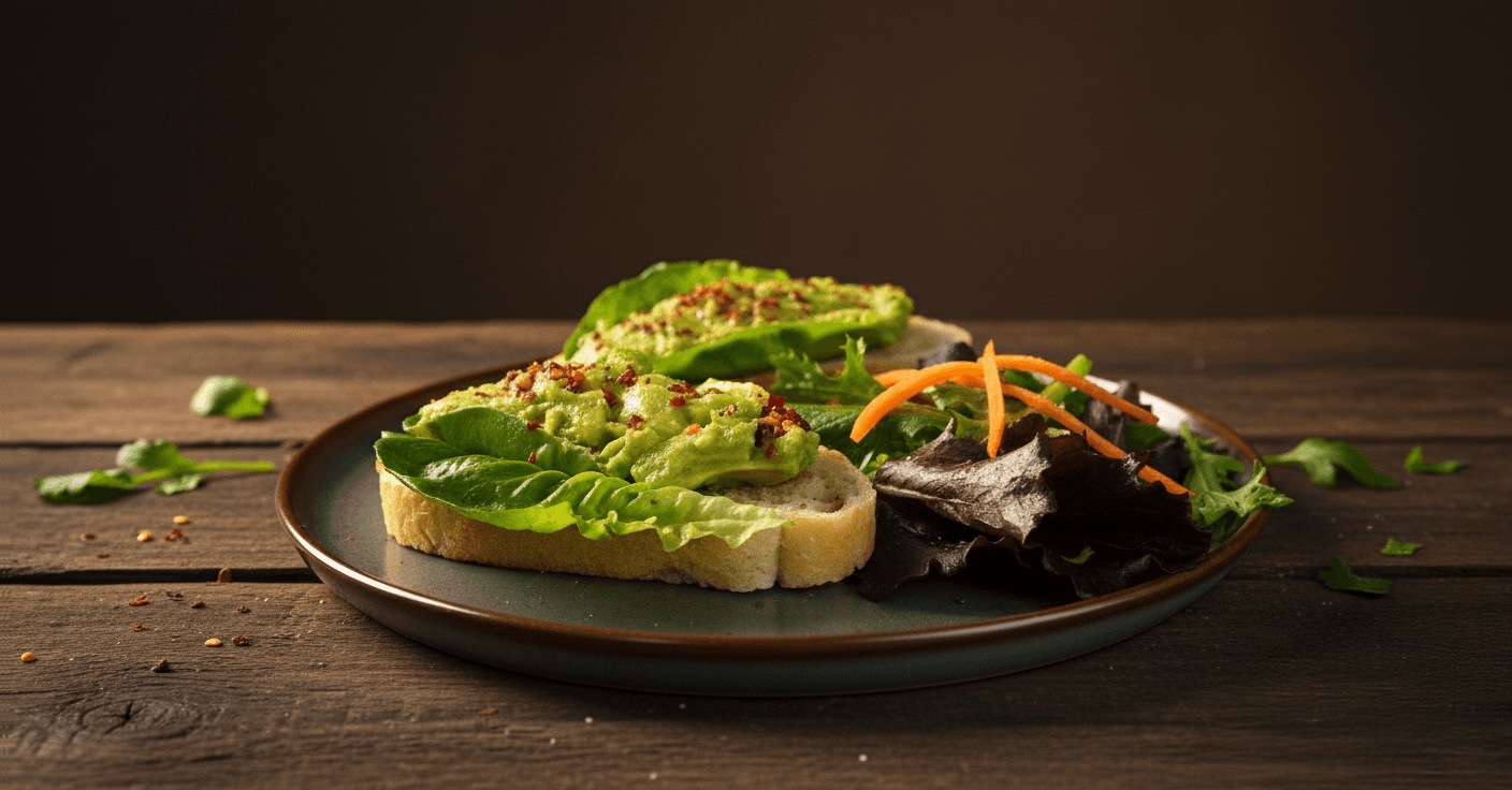 Pan de masa madre, aguacate, arúgula y chile seco.