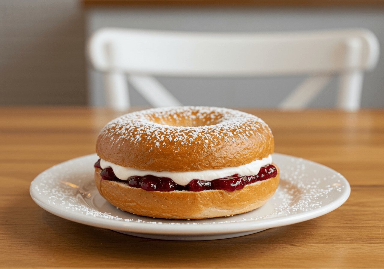Bagel con queso crema y mermelada de frutos rojos o higo.