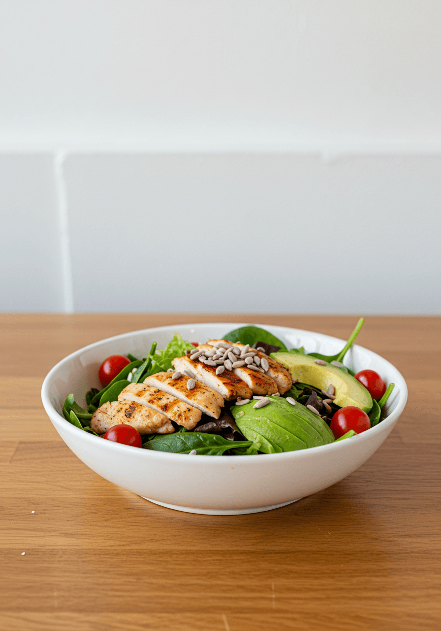 Hojas verdes, pollo, aguacate y vinagreta de mostaza y miel.